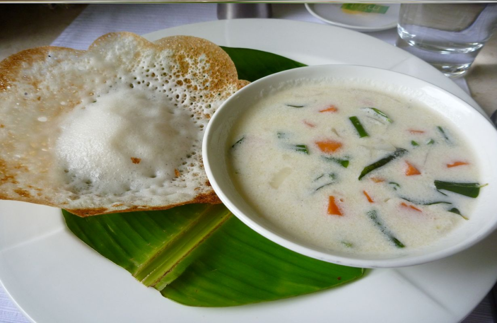 A soft rice pancake served with mild coconut-based stew (vegetable, chicken, or mutton).